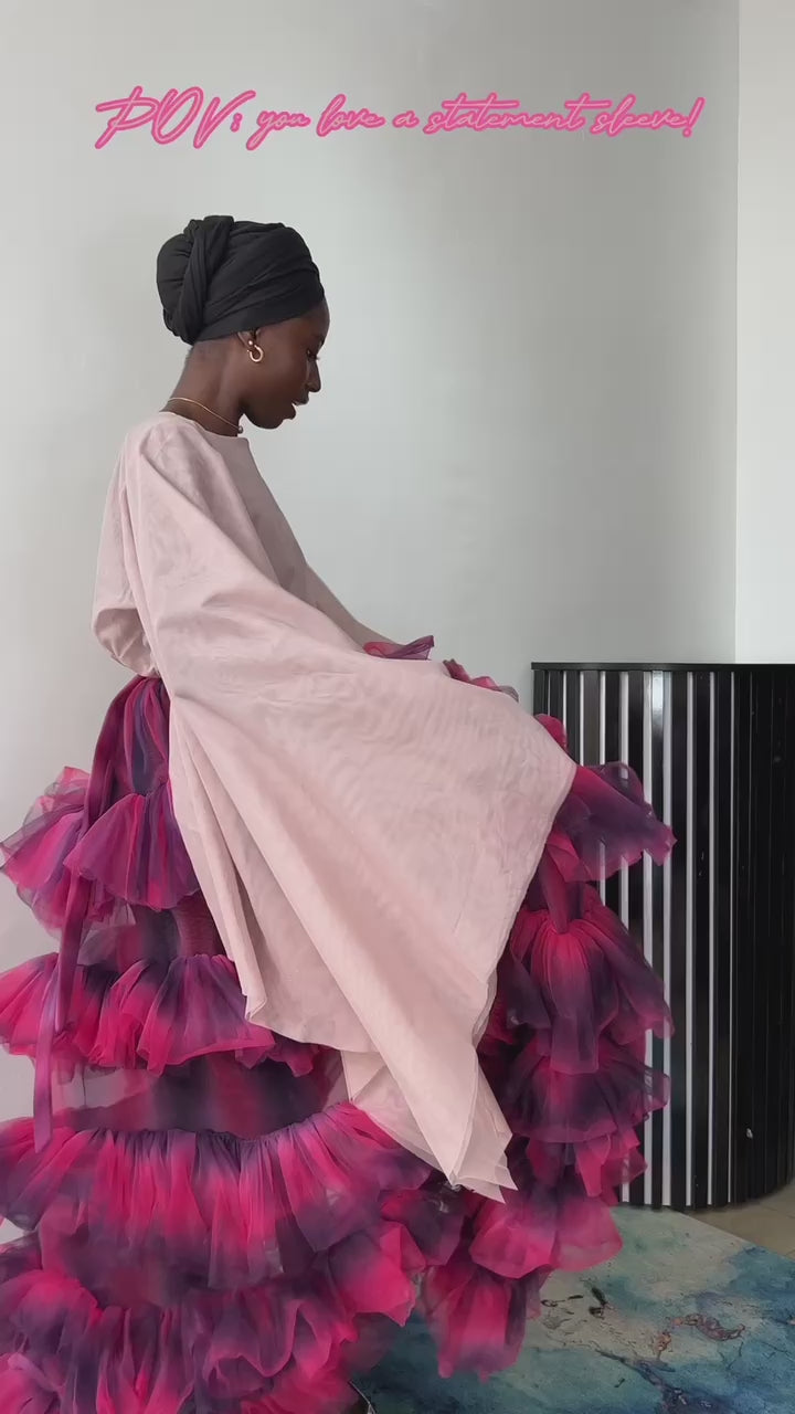 • Exaggerated flowy sleeves for a dramatic and chic look.