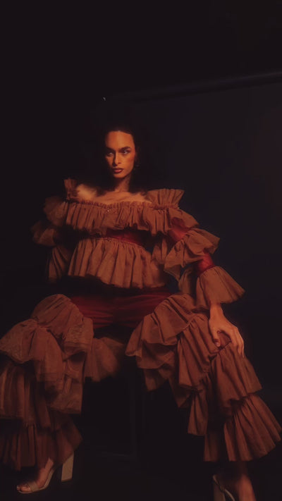 An ode to timeless elegance, the Hazel Pants are a masterpiece of craftsmanship and design. Rendered in a striking burnt copper hue, these high-waisted tiered pants capture the essence of modern sophistication with a hint of drama. The cascading ruffles are meticulously constructed to create fluid movement, embodying an effortless yet bold silhouette.