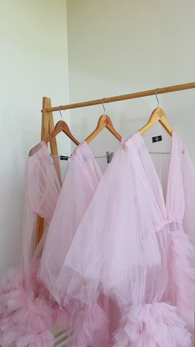 This light pink bridal shower tulle robe is the epitome of elegance and femininity. Crafted from delicate tulle fabric, it features intricate ruffle detailing along the edges, adding a touch of romance to the ensemble. Perfect for the bride-to-be to feel special and glamorous during her bridal shower festivities.