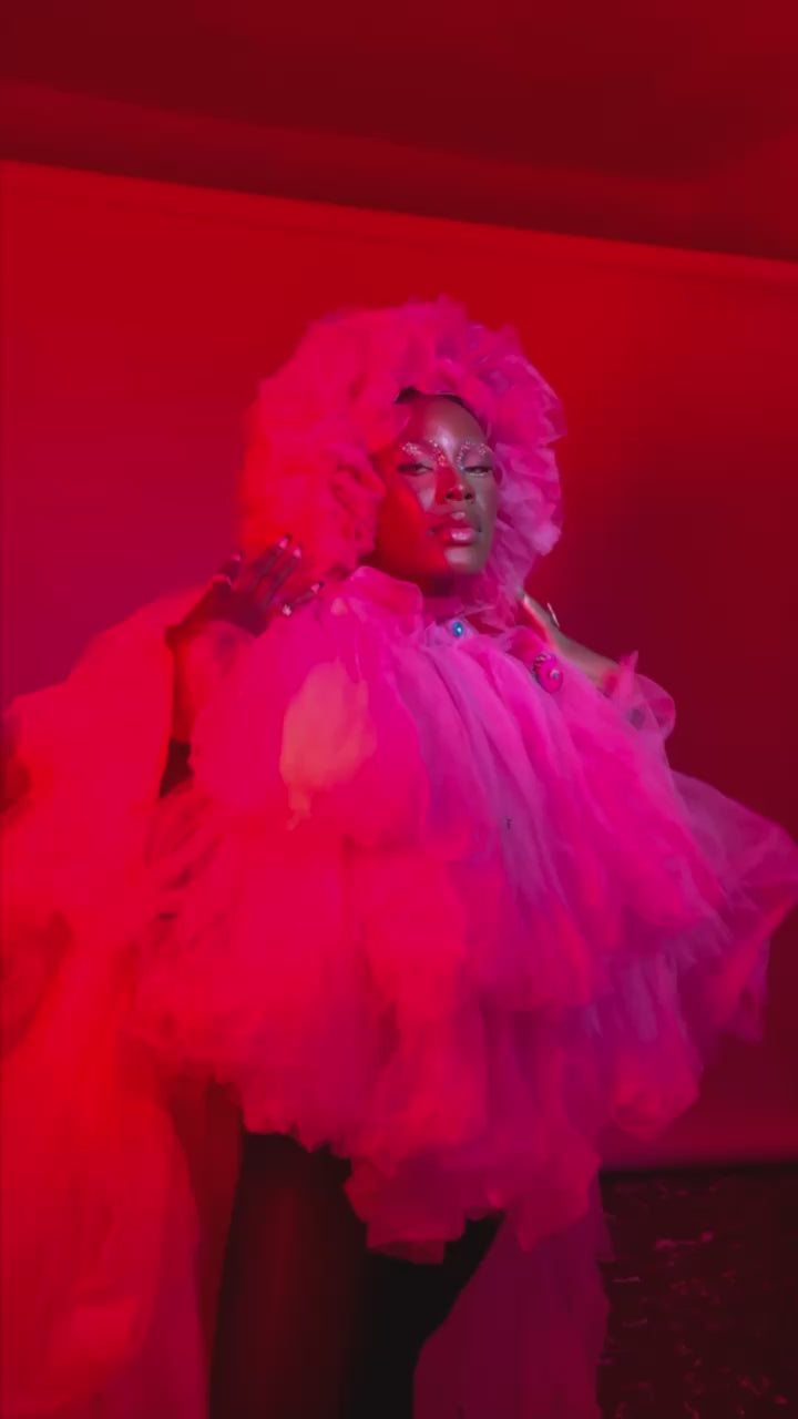 A mesmerizing ensemble that embodies romance and charm. Crafted from layers of soft and airy pink tulle, this gown creates a dreamy silhouette that flows with every step. Adorned with delicate butterfly embellishments scattered throughout the skirt, it adds a whimsical touch to the ensemble.
