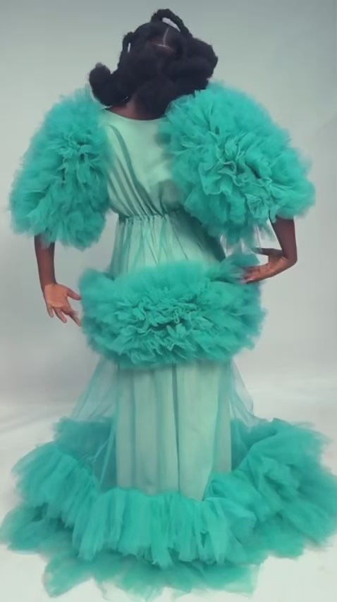 This stunning sea green tulle V-neck dress, accentuated with charming ruffles on the sleeves, midsection, and hem. Perfect for any occasion, this elegant dress exudes feminine grace and style.